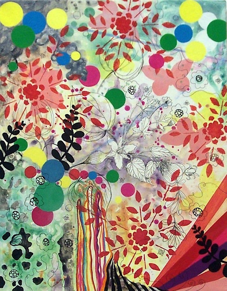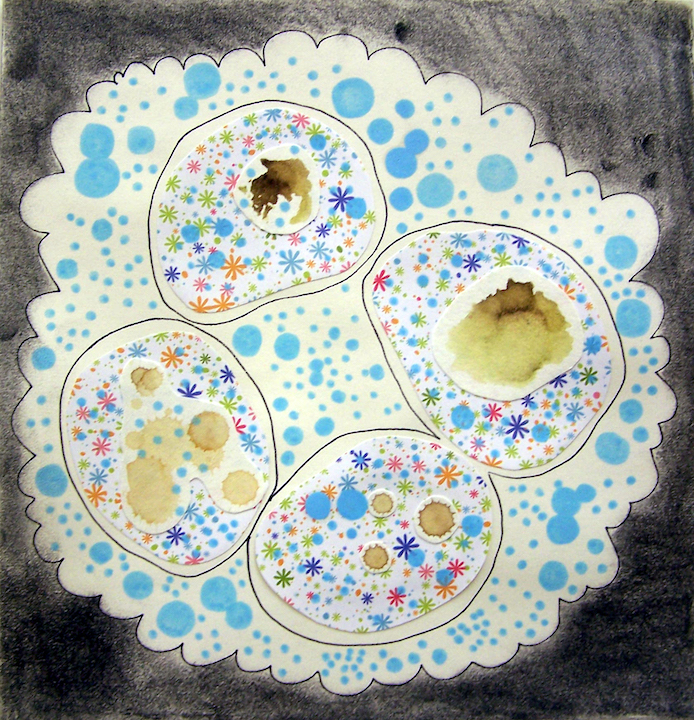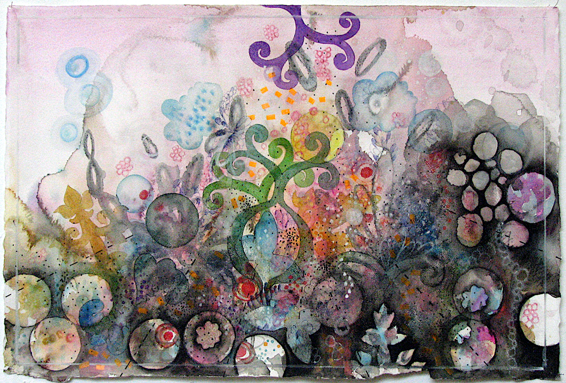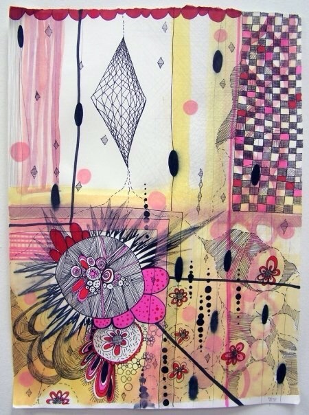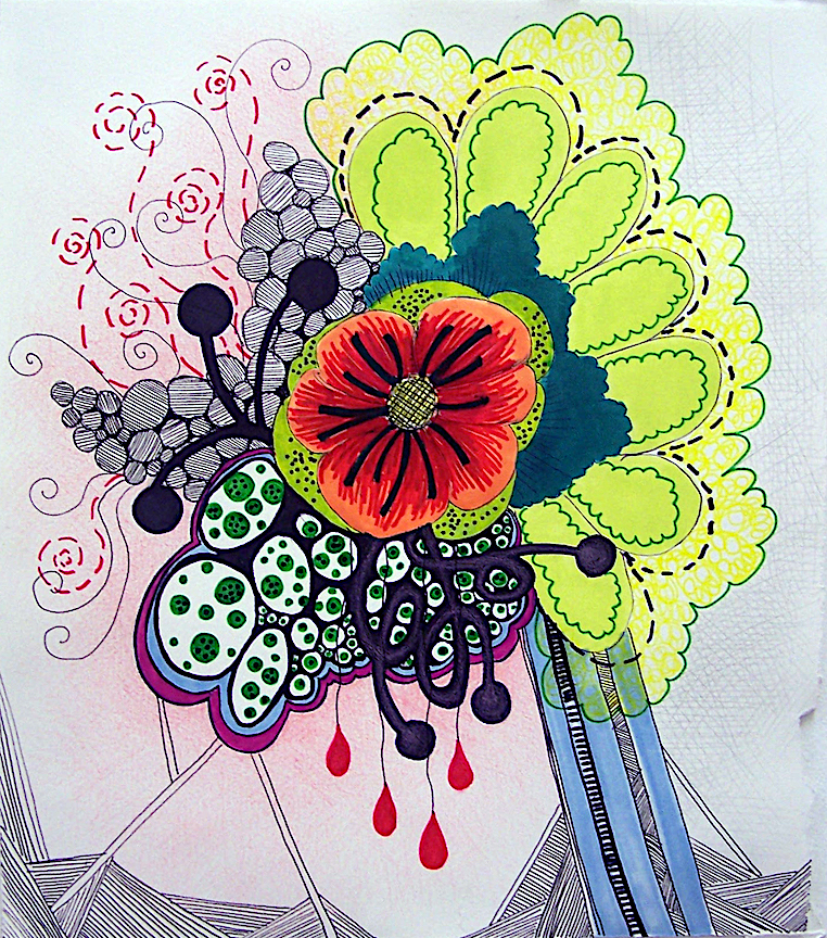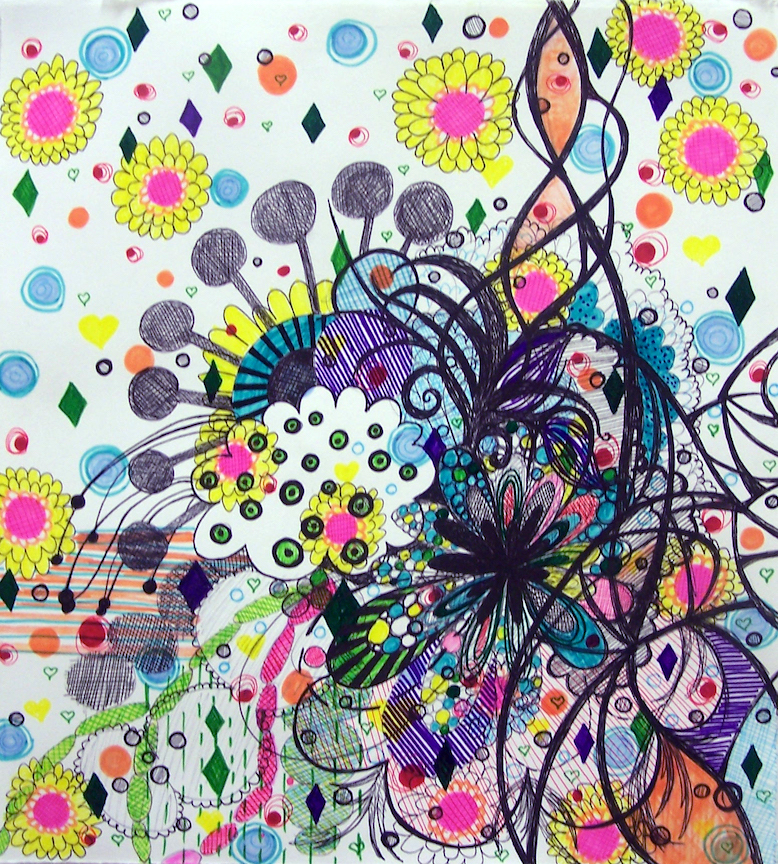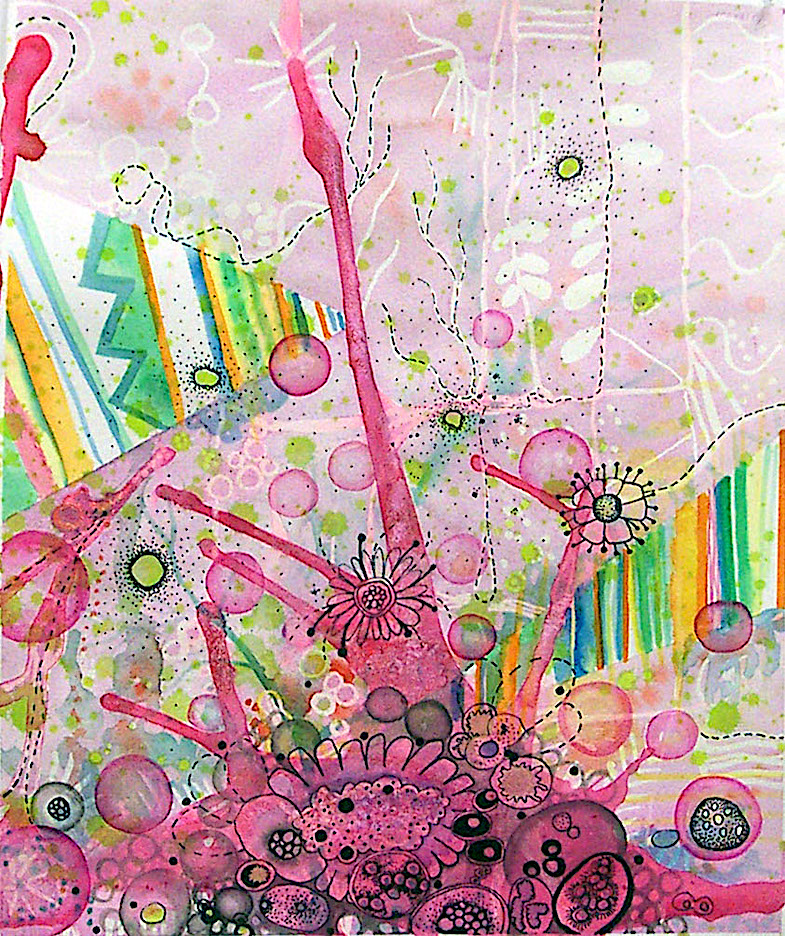 These early works explore intuitive mark making, collage, and doodling while learning how to mix different drawing media. It was an experimental and explorative. My early influences were: cells and microbiology, complex systems, flowers, patterns, and “sweet”, candy-like colors.