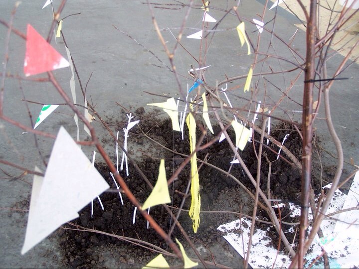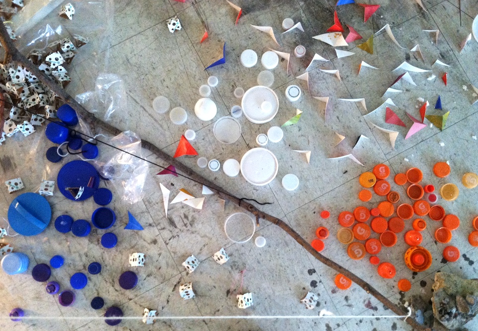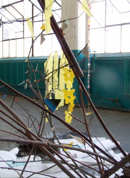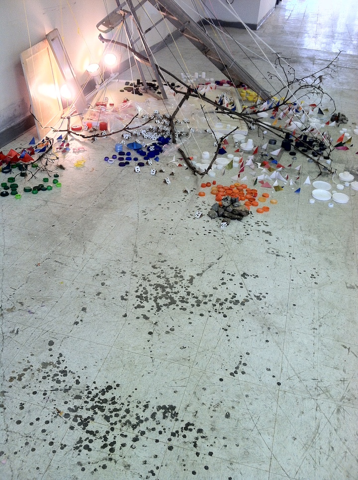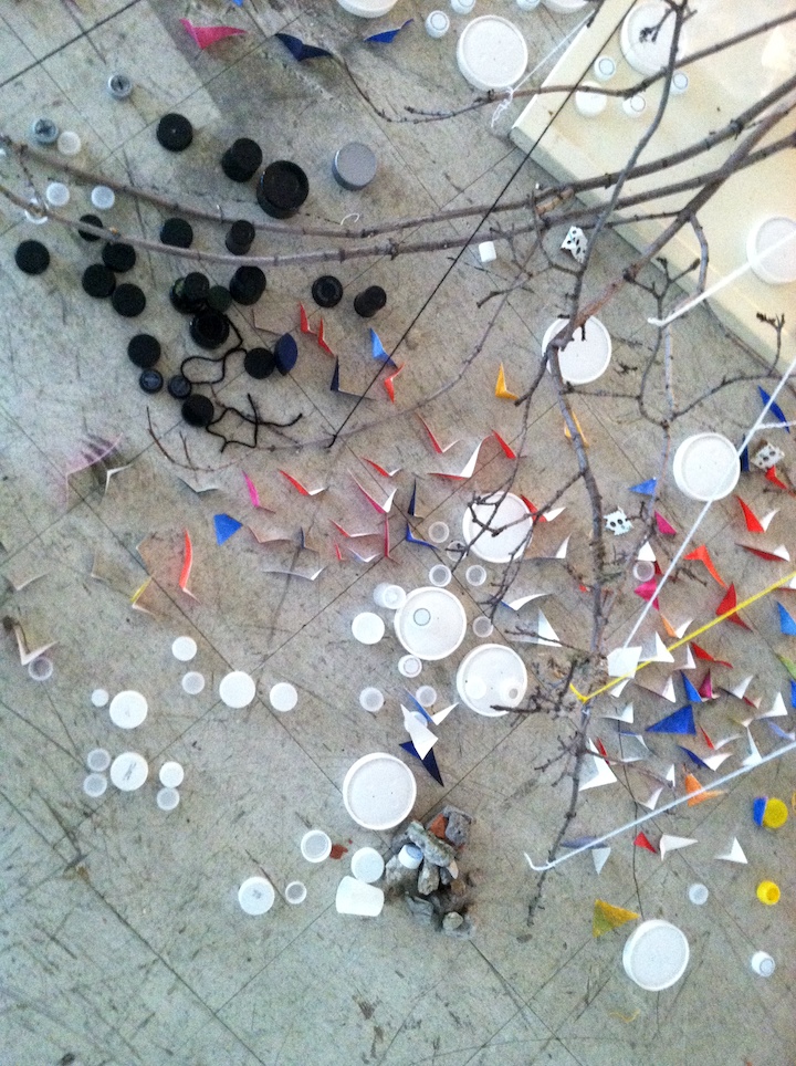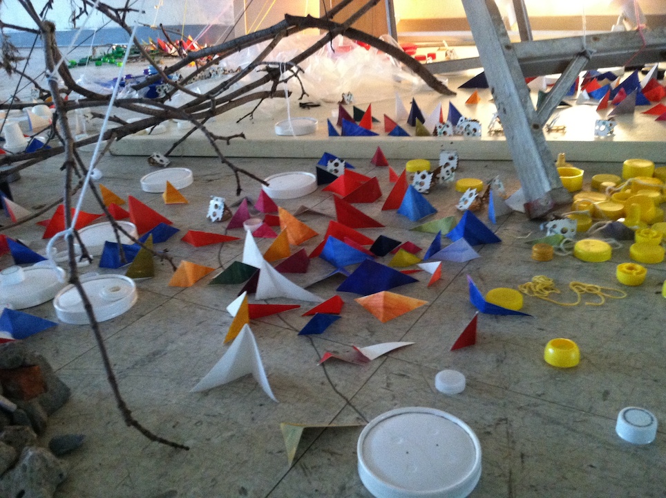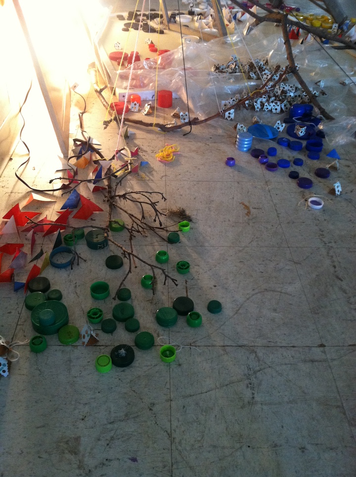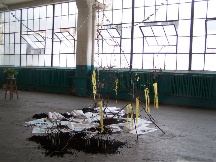 Untitled (What Matters to Me Installation #1), Found materials, old blue prints, branches, painted sticks, post-consumer waste (junk mail and tissue paper) ,scrap paper cutouts, string, yarn, and dirt, 12′ x 12′ x 15′ approximately