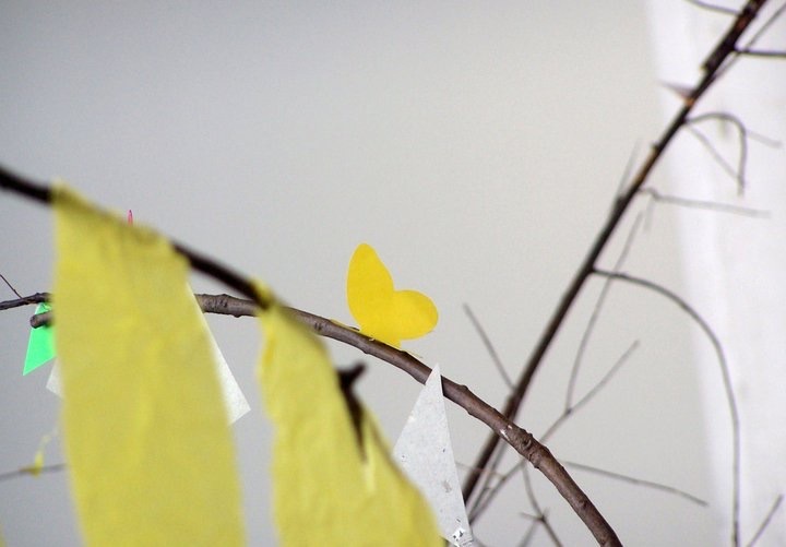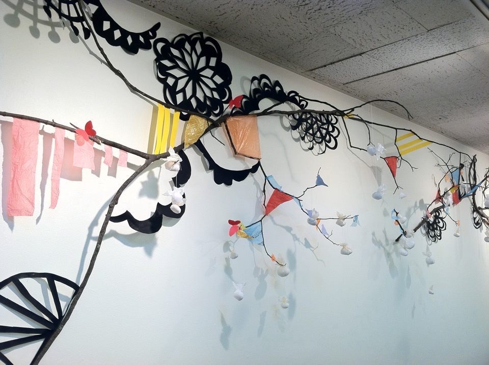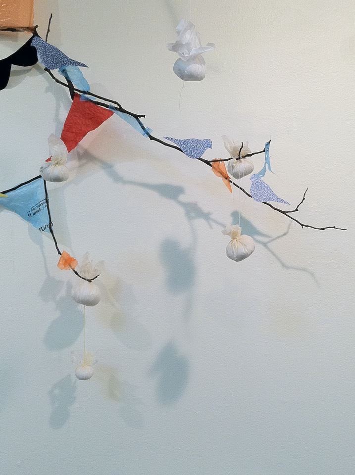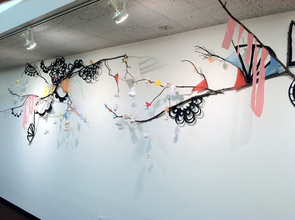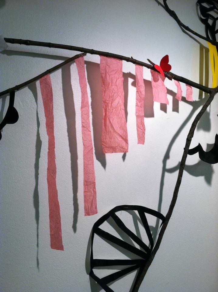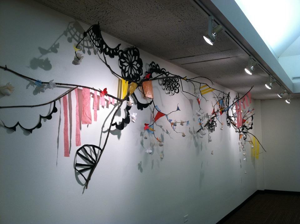 Untitled (wall installation), Found materials, post-consumer waste, branches, paper cutouts, branches, string, glue, tacks, and nails, ’40 x 10′ x 2′ approximately