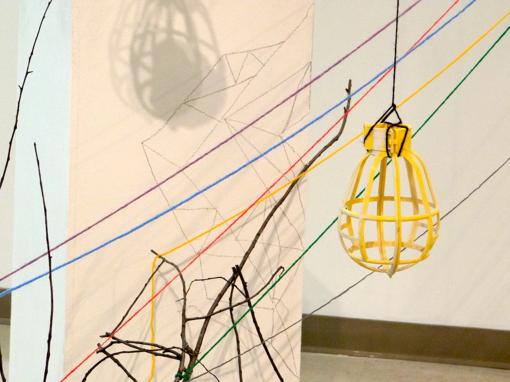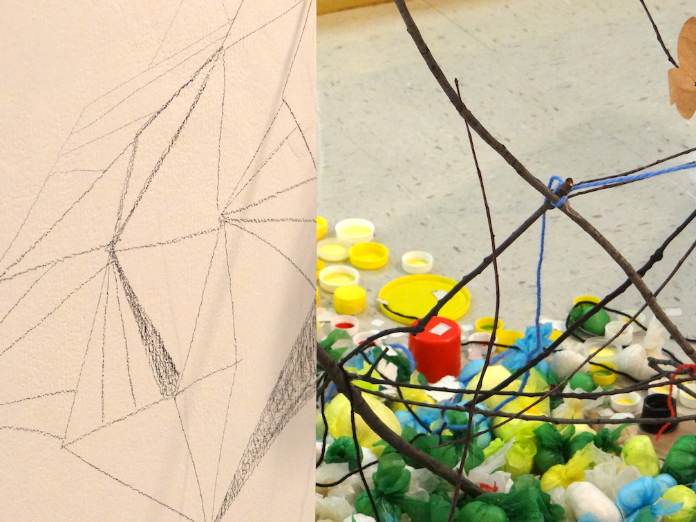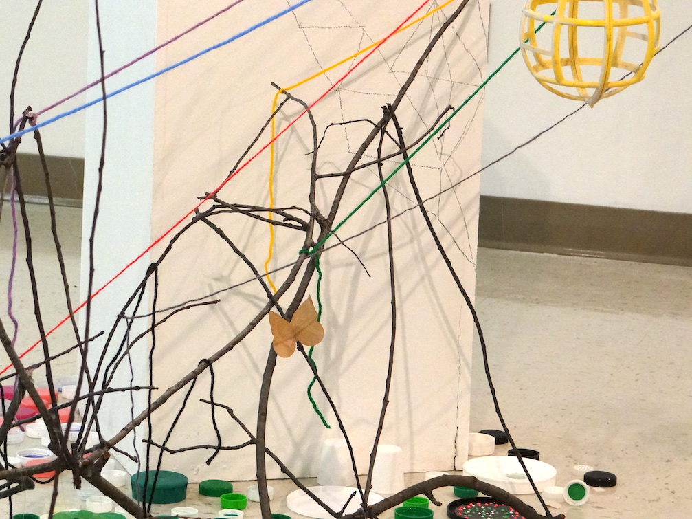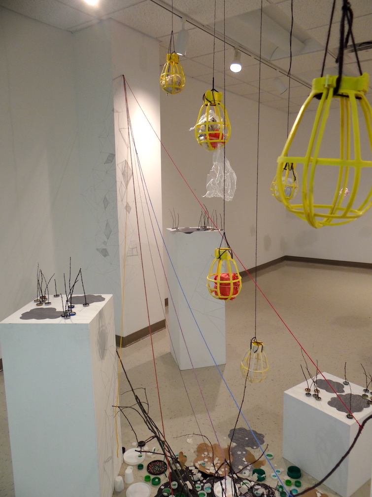 Untitled (Kent State Stark Gallery Installation), Pedestals from the site, collected post-consumer waste, yarn, graphite drawing, sticks and branches, tacks, and glue, 20′ x 10′ x 12′ approximately
