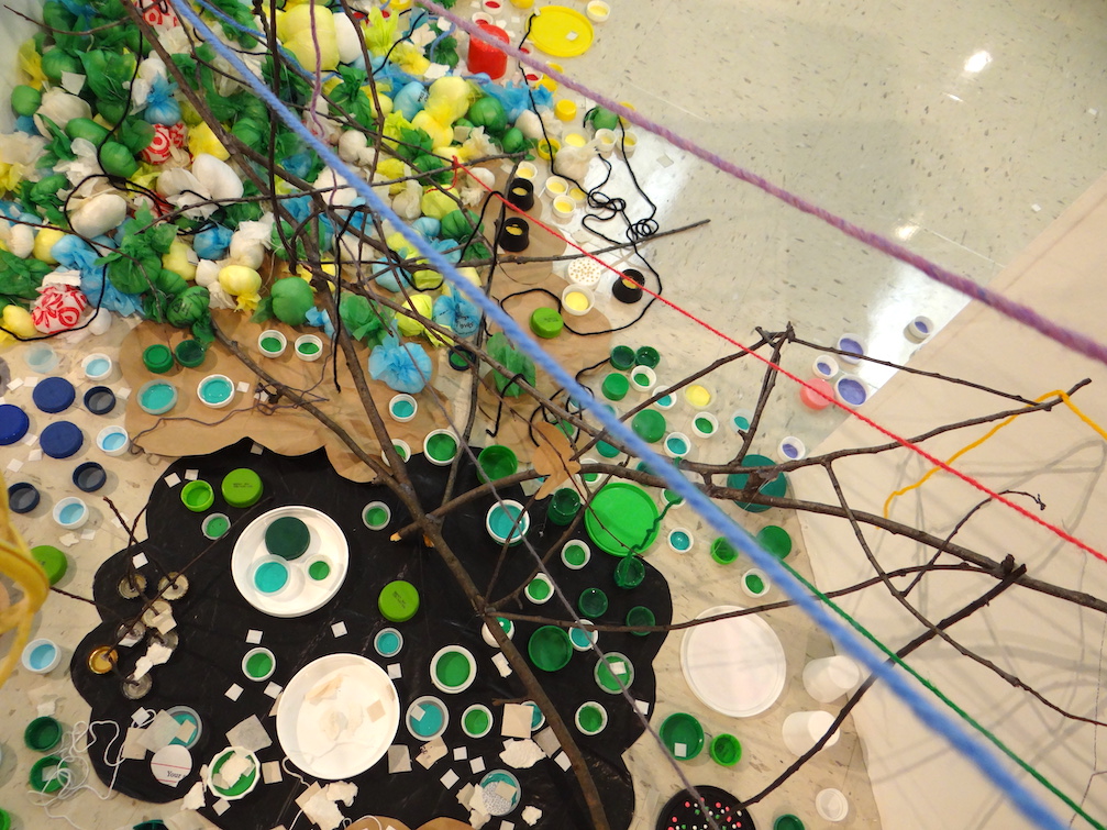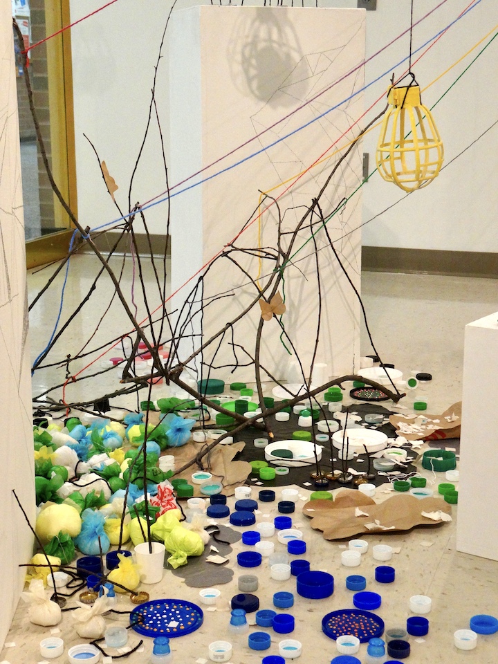 Window Installation: All Entwined, Collected post-consumer waste (lids, junkman, and paper), twine, paint, glue, and tacks, 10′ x 8′ x 4′ approximately