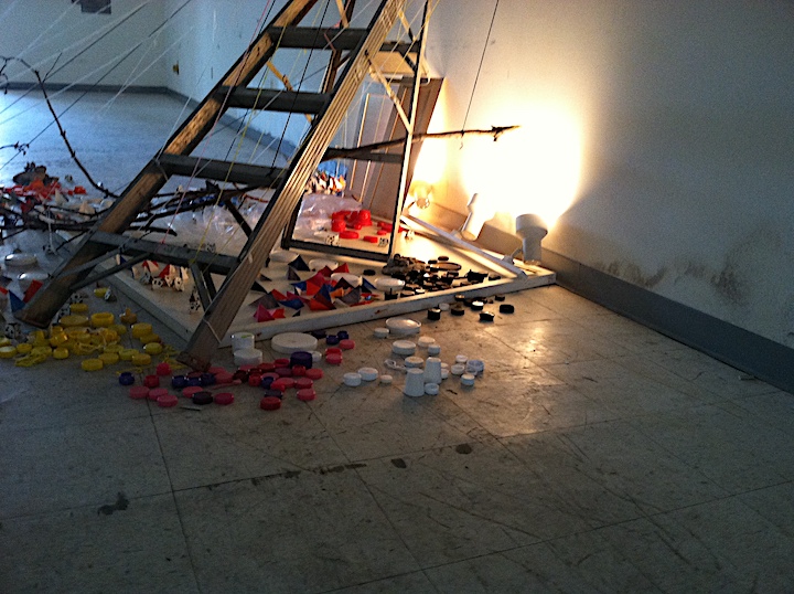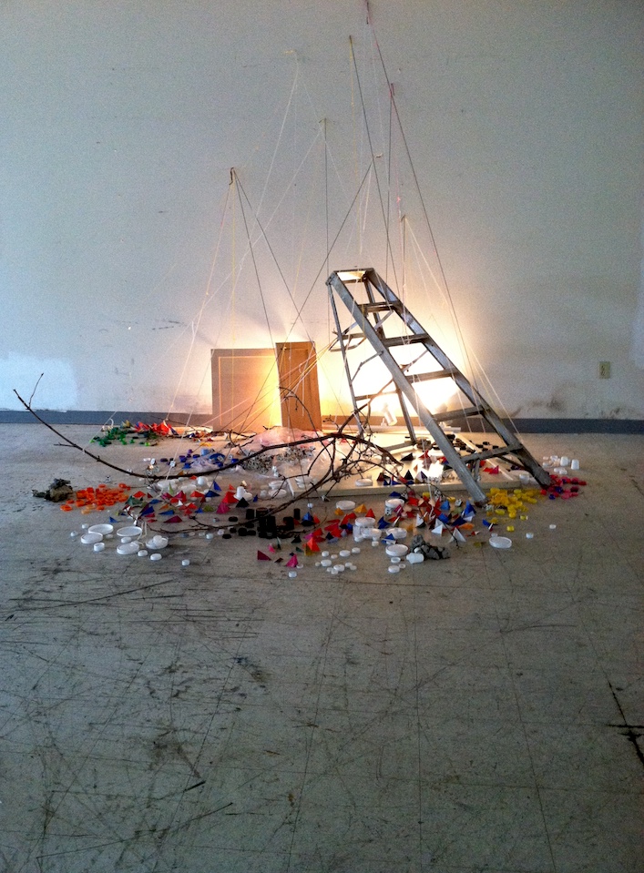Untitled (Firelands Festival Installation), found materials from the site (ladder, wood panel, plastic, and light), yarn, tacks, folded paper scraps, collected post-consumer waste, branches, and rocks, 14′ x 14′ x 10′ approximately